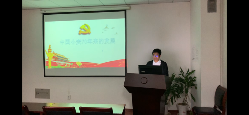 首先,陶柱君同志开展了“中国小麦生产70年”的微党课,他讲到中国小麦70年来亩产逐年升高,2008达到了317.5公斤/亩。无数科研工作者为小麦的育种工作付出了巨大的贡献,其中代表人物有中国科亚洲博彩平台排名