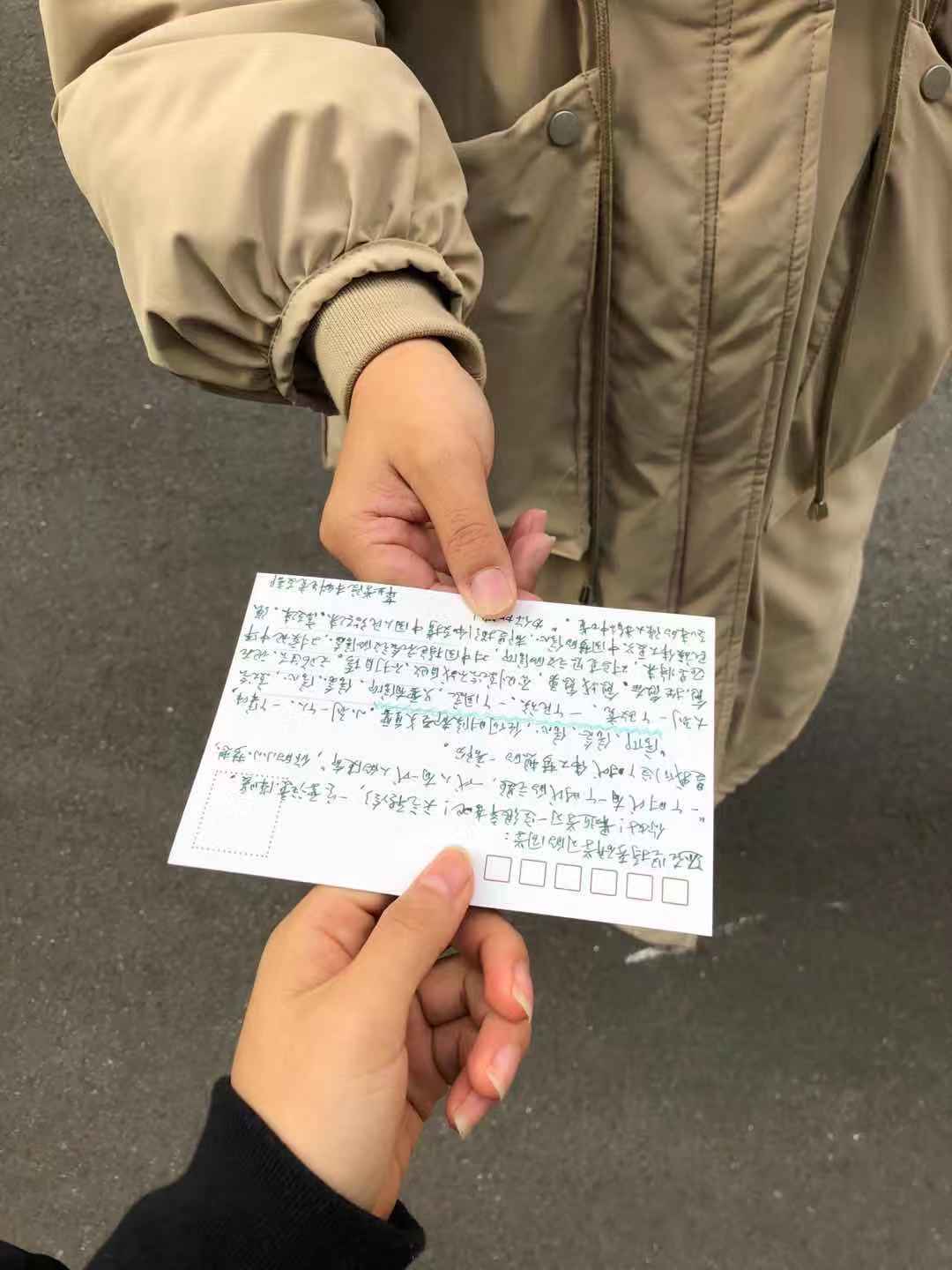 党员同志们针对宿管阿姨、门房大爷、授课老师、快递小哥等服务于我们身边的工作者们在南农贺卡上写下相关“初心与使命”的鼓励与冬日的温情祝福,并把贺卡亲手呈送。